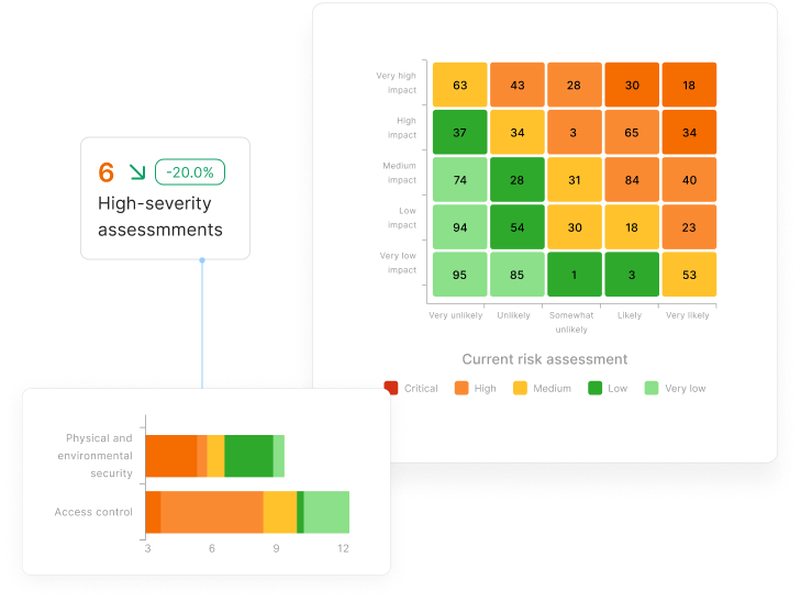 Luontainen riski ja jäännösriski lasketaan jatkuvasti kontrollien tilan, kattavuuden ja havaittujen poikkeamien perusteella. Näet suoraan, miten yksittäinen kontrolli vaikuttaa kokonaisriskiin.
